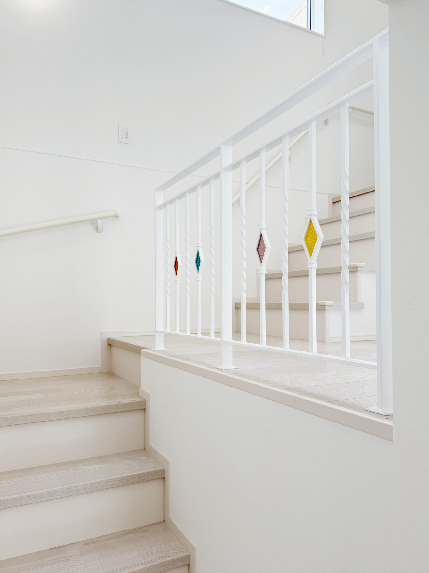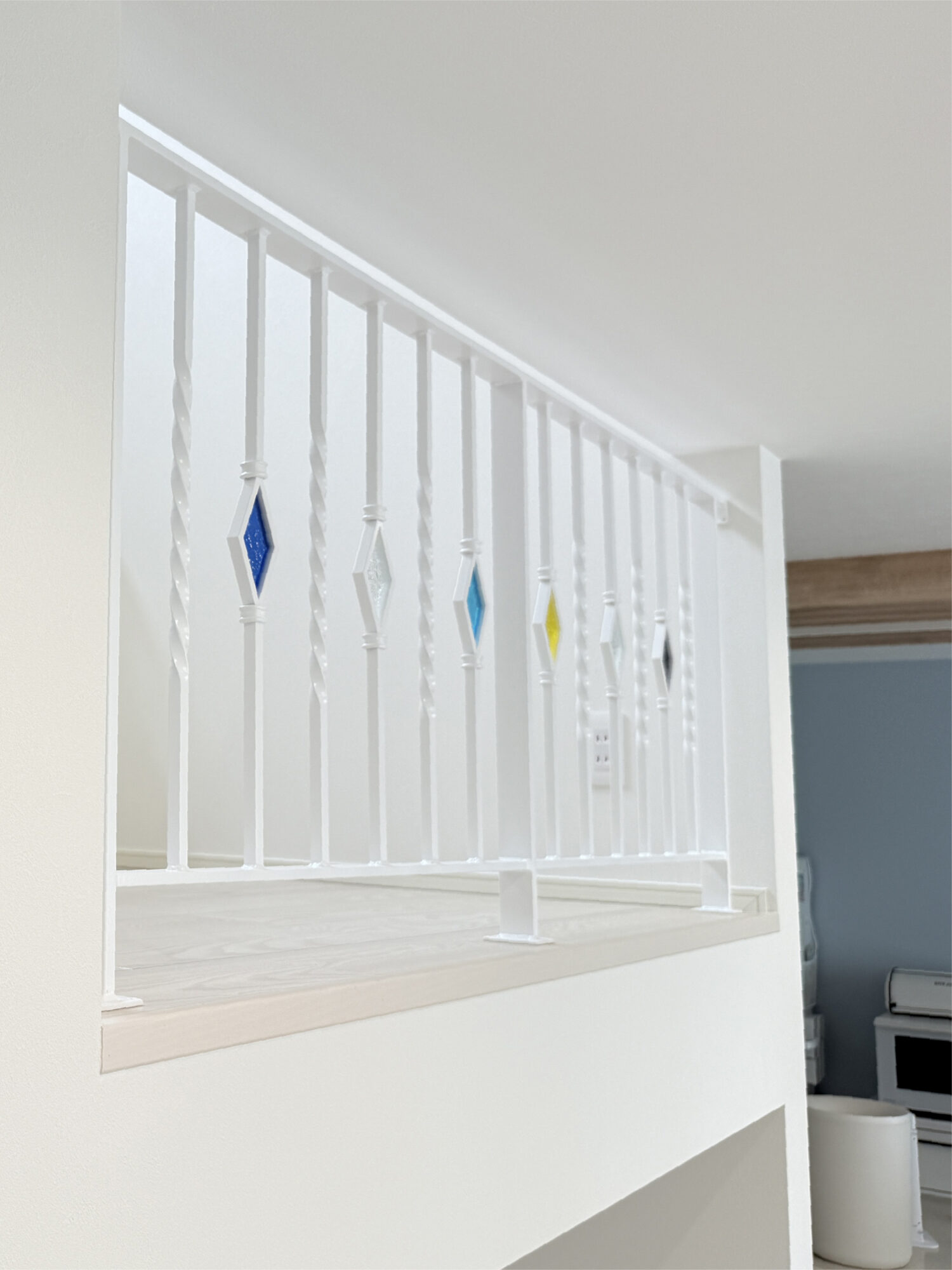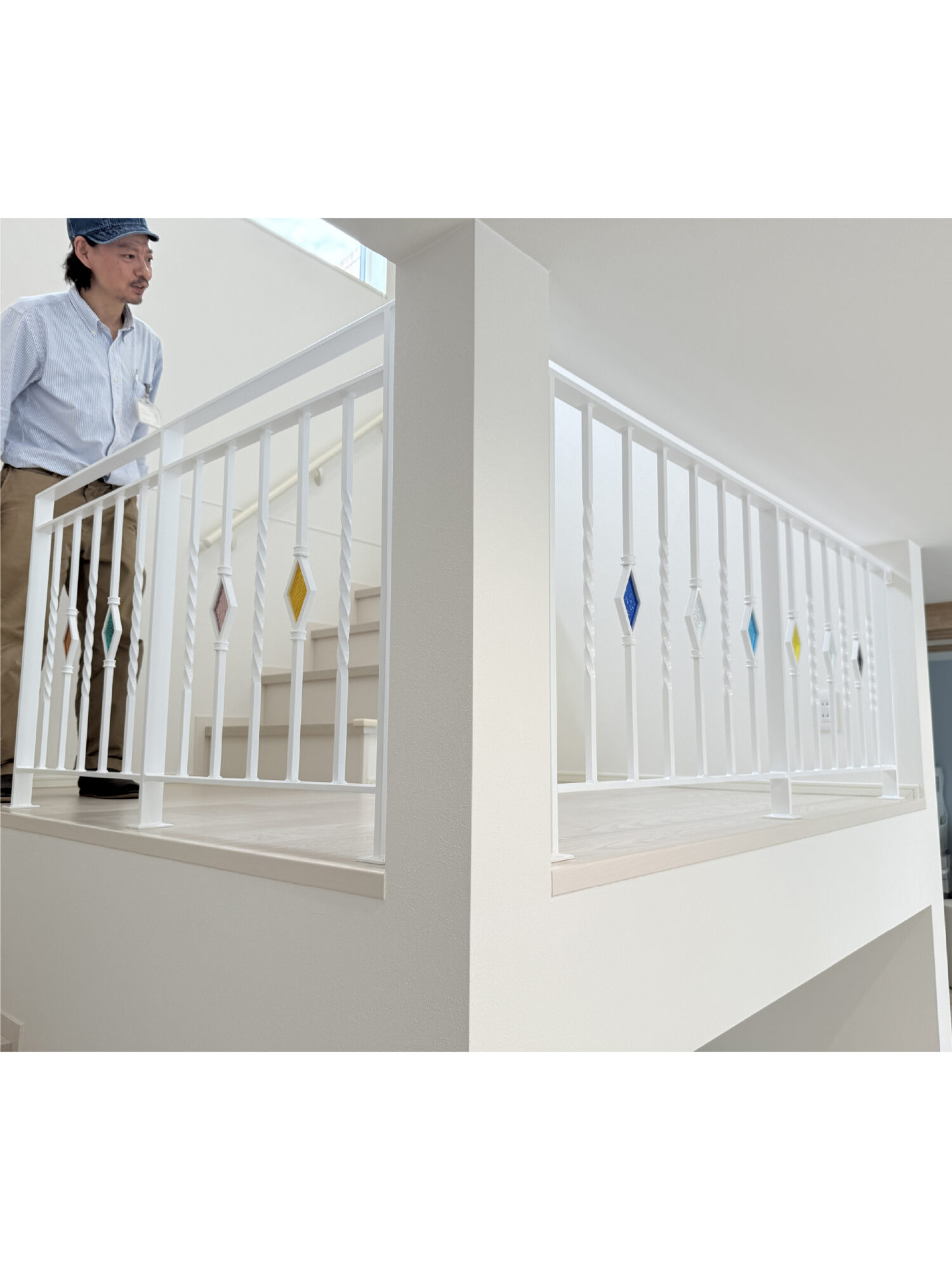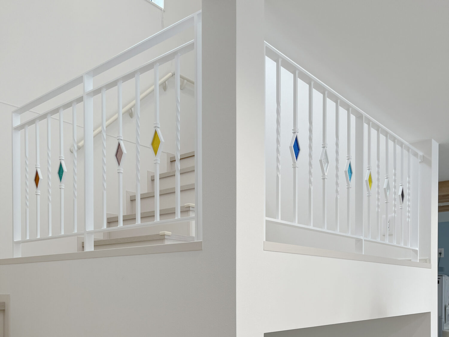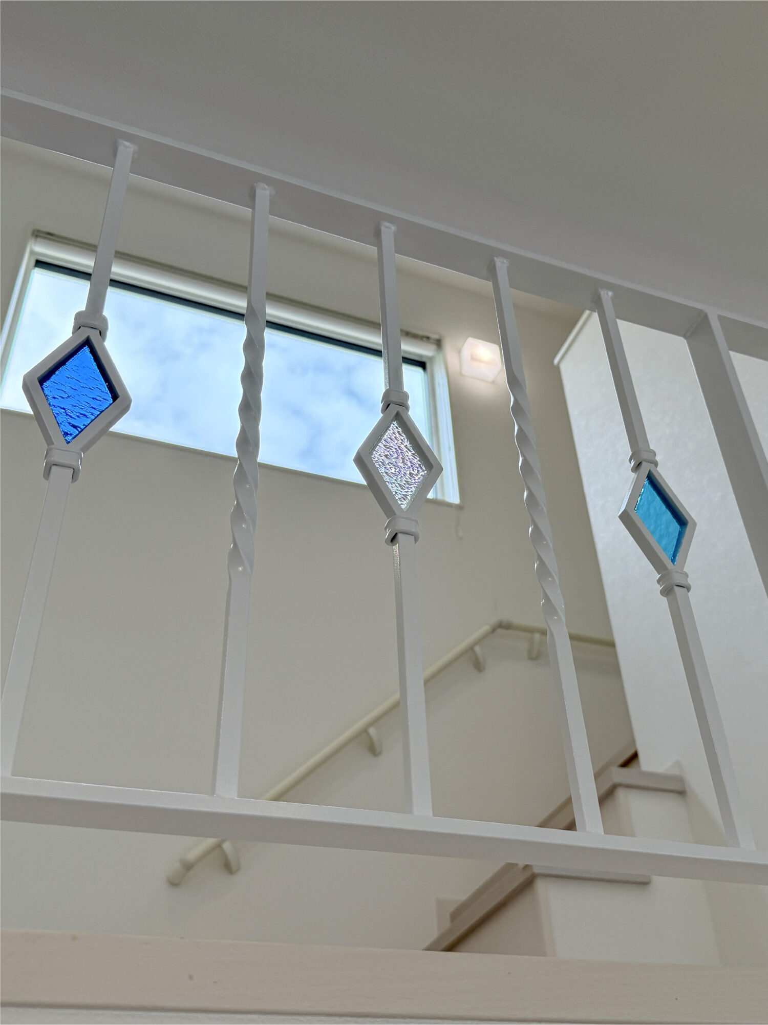 今回の注目ポイントは、2F吹き抜け手すり4枚のステンドグラス!ダイヤのステンドとリーフのステンドを混ぜ、それぞれが春夏秋冬をイメージしたカラーにしました。