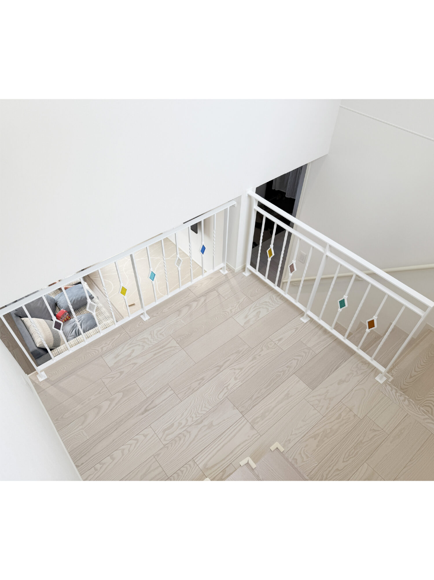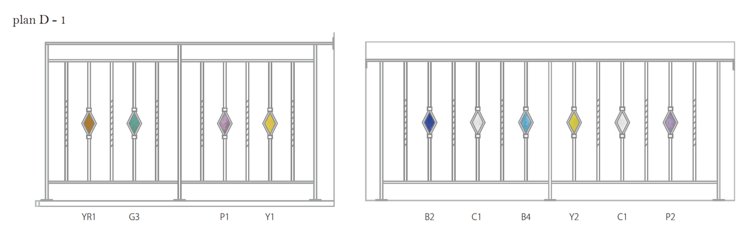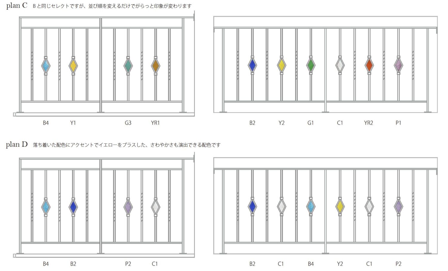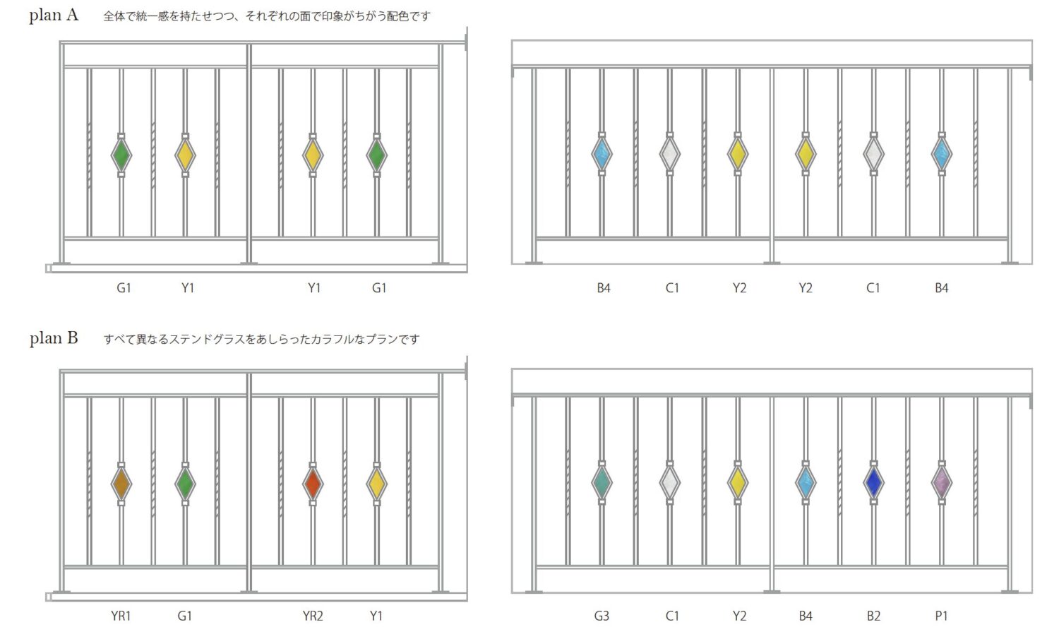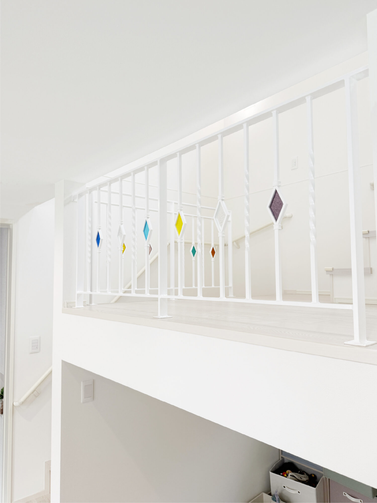10枚のうち、重複しているのはC1のなないろだけで、他はすべて異なるガラスです。同じ黄色でも青みの黄色と赤みの黄色だったり、エンボス模様が違ったりと眺めているだけで楽しい気持ちに♪ ホワイトを基調としたナチュラルテイストのお部屋にぴったりの手すりになりました。