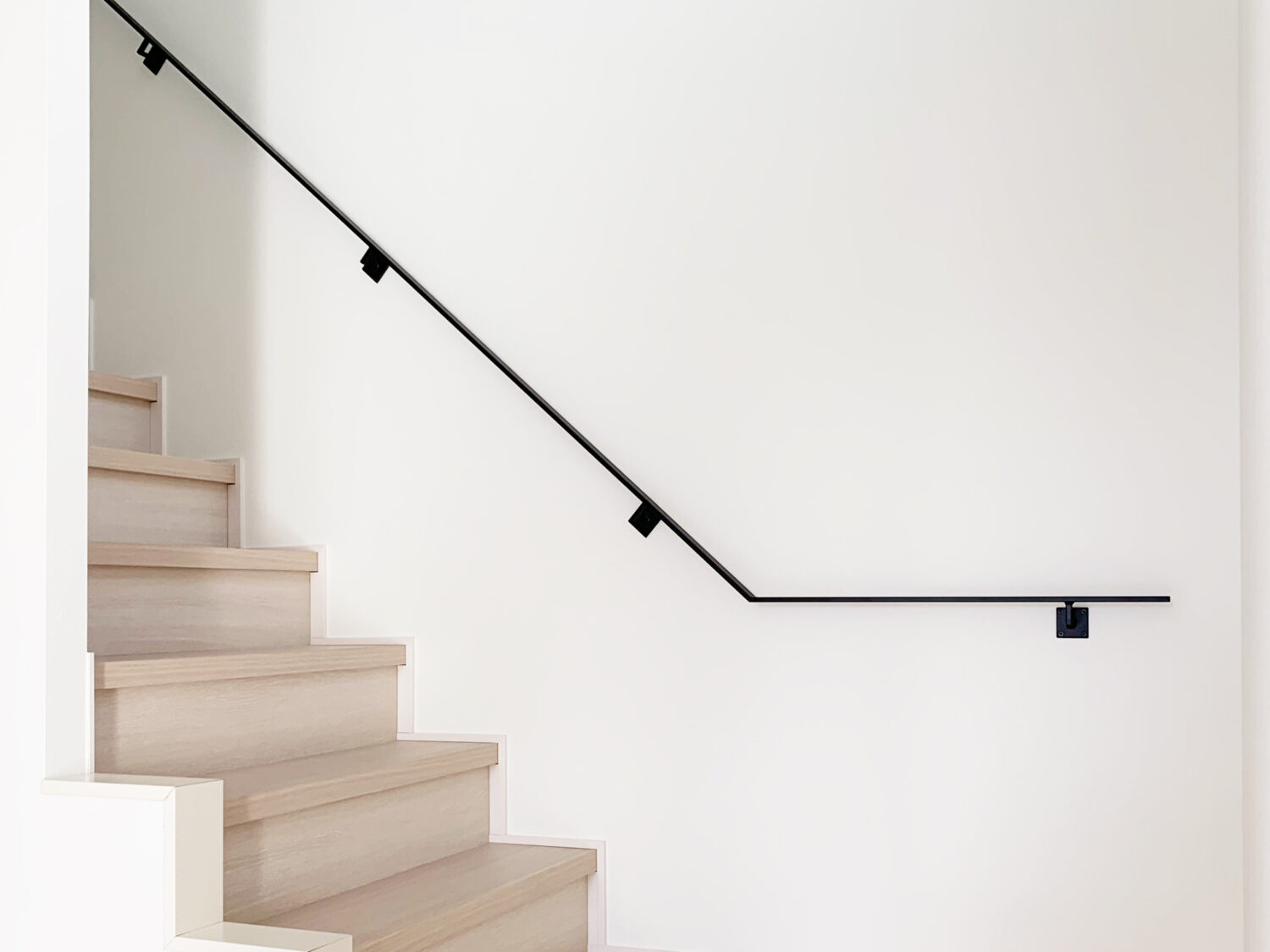5段目からの手すりには、フラットバーシリーズの壁付けタイプをご依頼いただきました。階段の流れを邪魔せず、空間全体の統一感を保つようデザインしています。