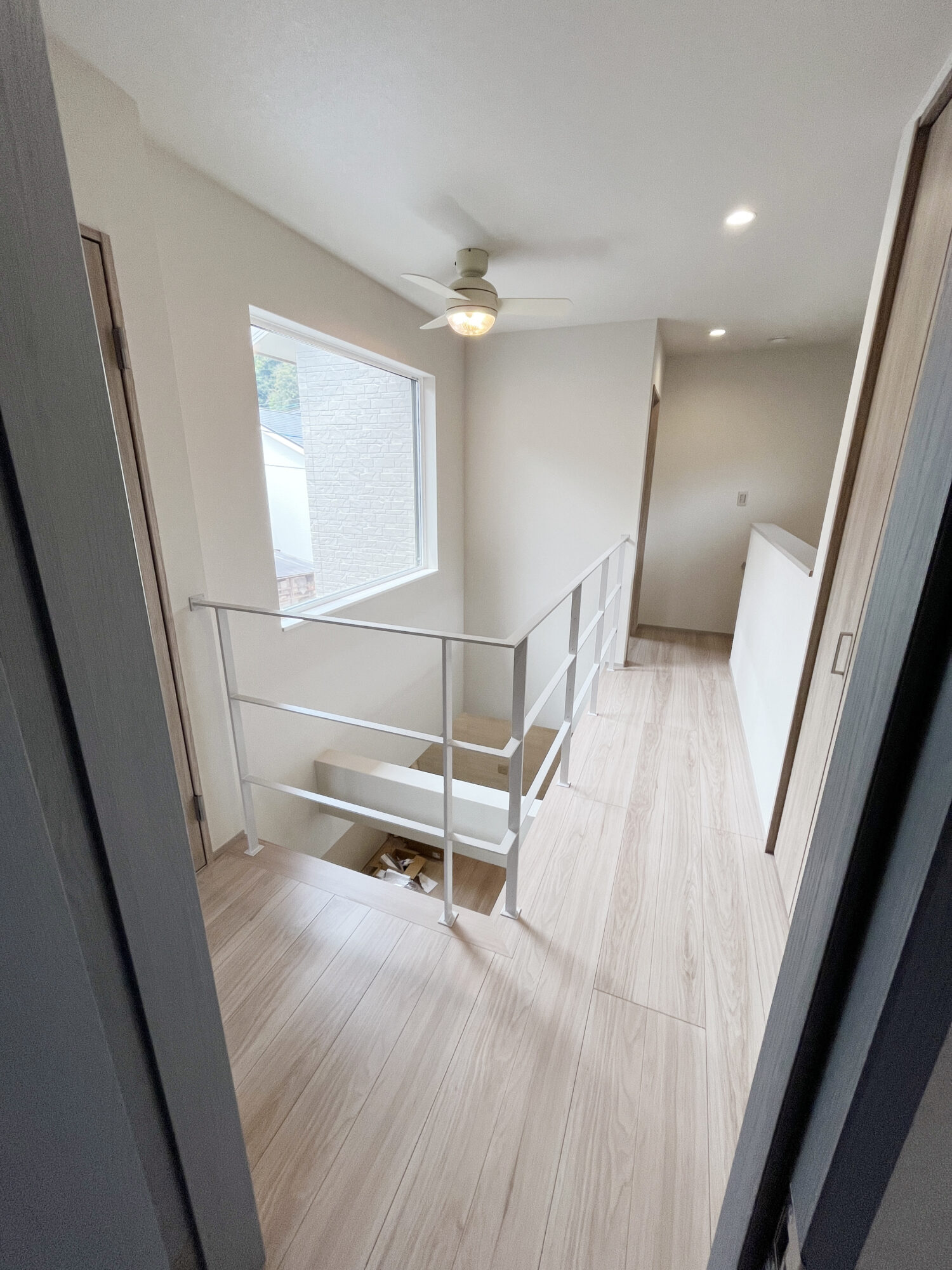 京都のお住まいに、グレージュカラーの吹き抜け手すりと階段手すりを製作しました。