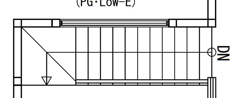 少し変則的ですが、はじまりにいきなり90度向きを変えるこのタイプをよく現場でみかけます。メリットとしては『床面積が狭い場合に有効』!まっすぐ上る直階段と違い、初めに向きをかえるのでコーナーから始めることができ、リビング階段によく使用されています。この図ははじめ2段で90度に曲がりますが、3段でまがったり、1段前に出して2〜4段目で曲がったり、間取りと用途によって様々なパターンがあります。