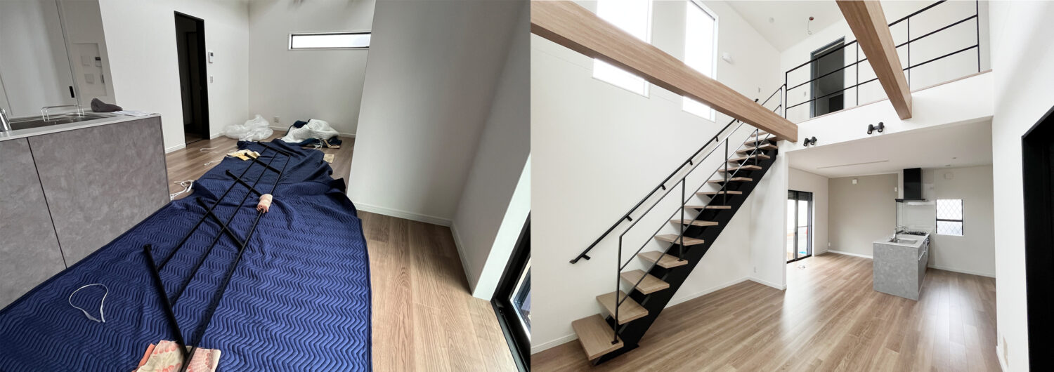 取り付け作業日は美装作業と完了検査との間に設定いただくことをお勧めしています。畳やサッシと同じ位置付けです。特に階段まわりは上り下りも激しく、誤って傷などがつく恐れもあるため、ご配慮いただけるとありがたいです。