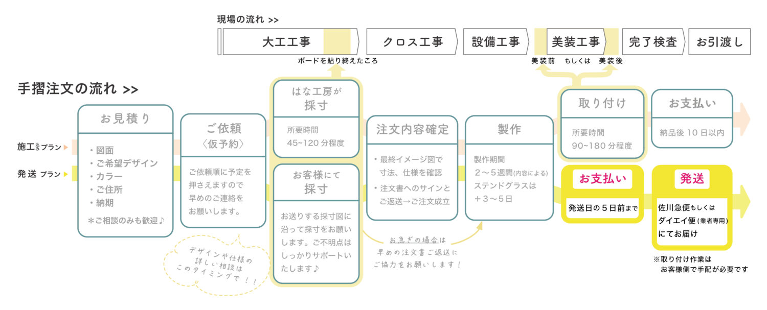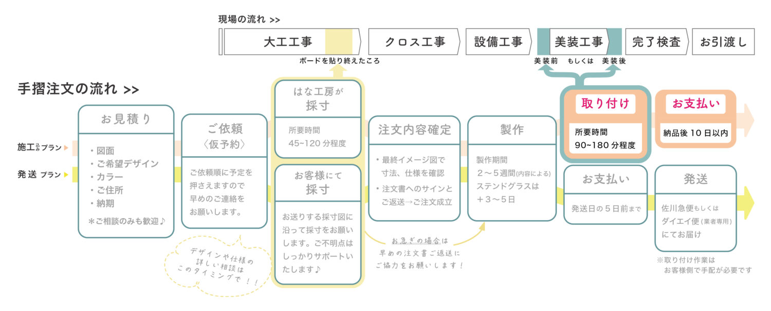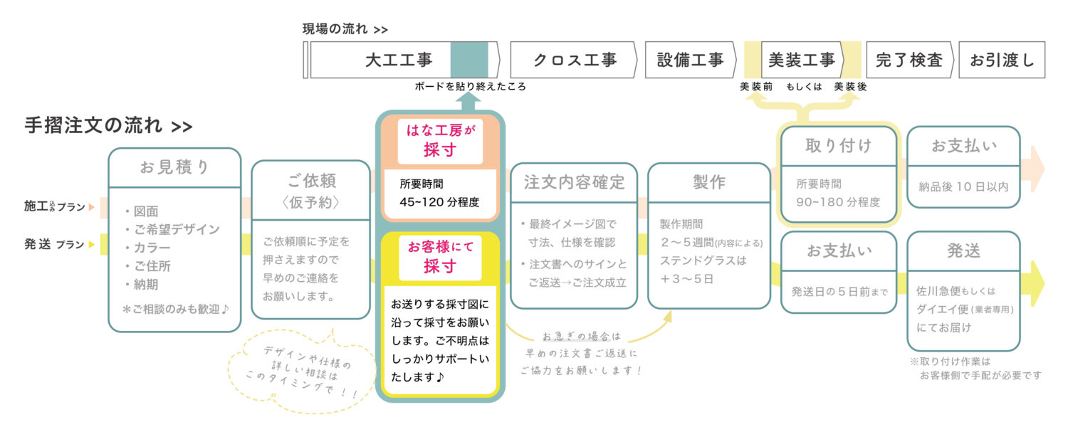 アイアン手すりと新築現場の一般的な工程の流れはこのようなイメージ。上段が一般的な現場の流れ、下段が手すり注文の流れです。