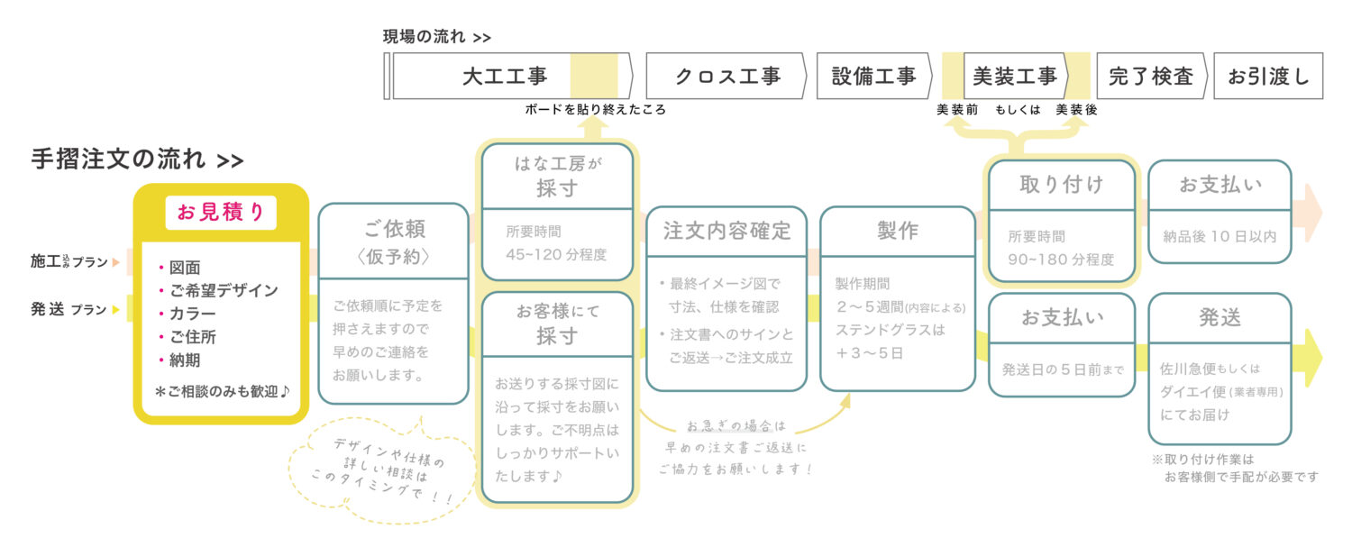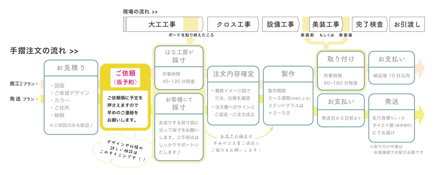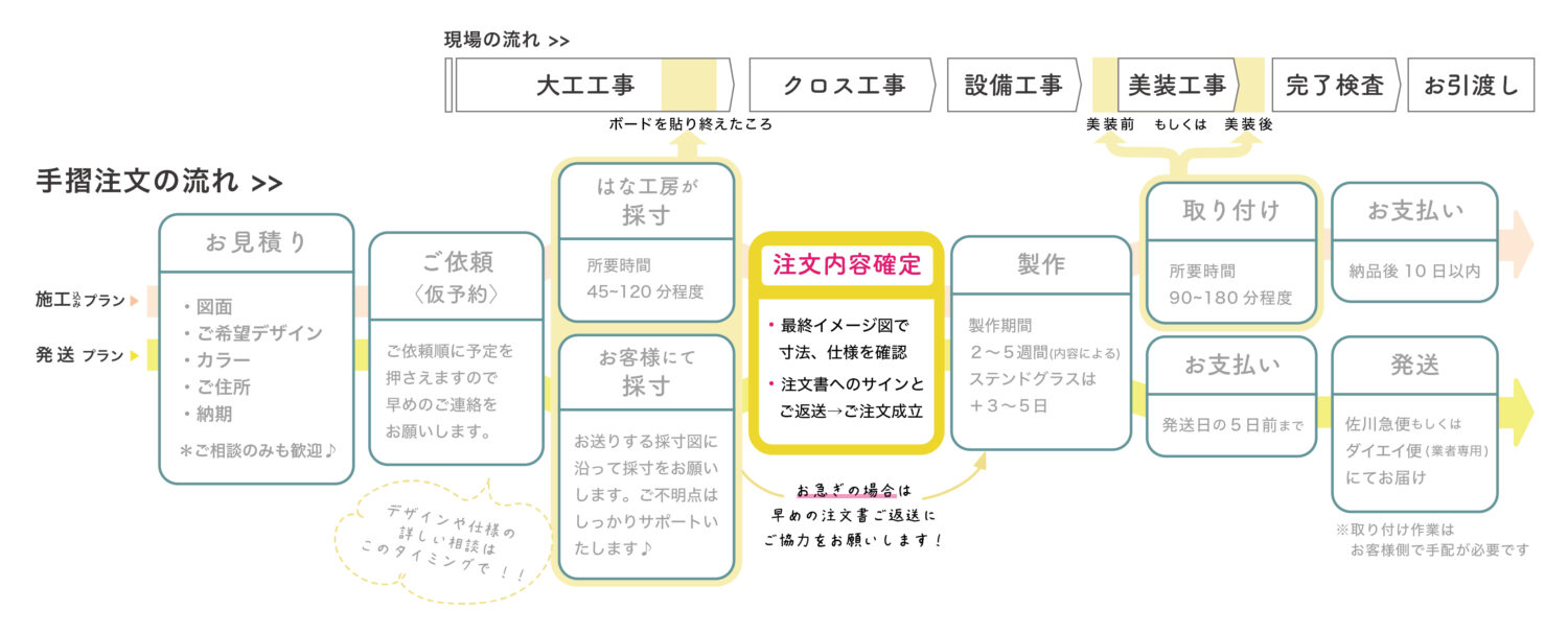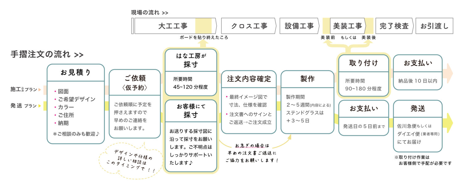 アイアン手すりと新築現場の一般的な工程の流れはこのようなイメージ。上段が一般的な現場の流れ、下段が手すり注文の流れです。