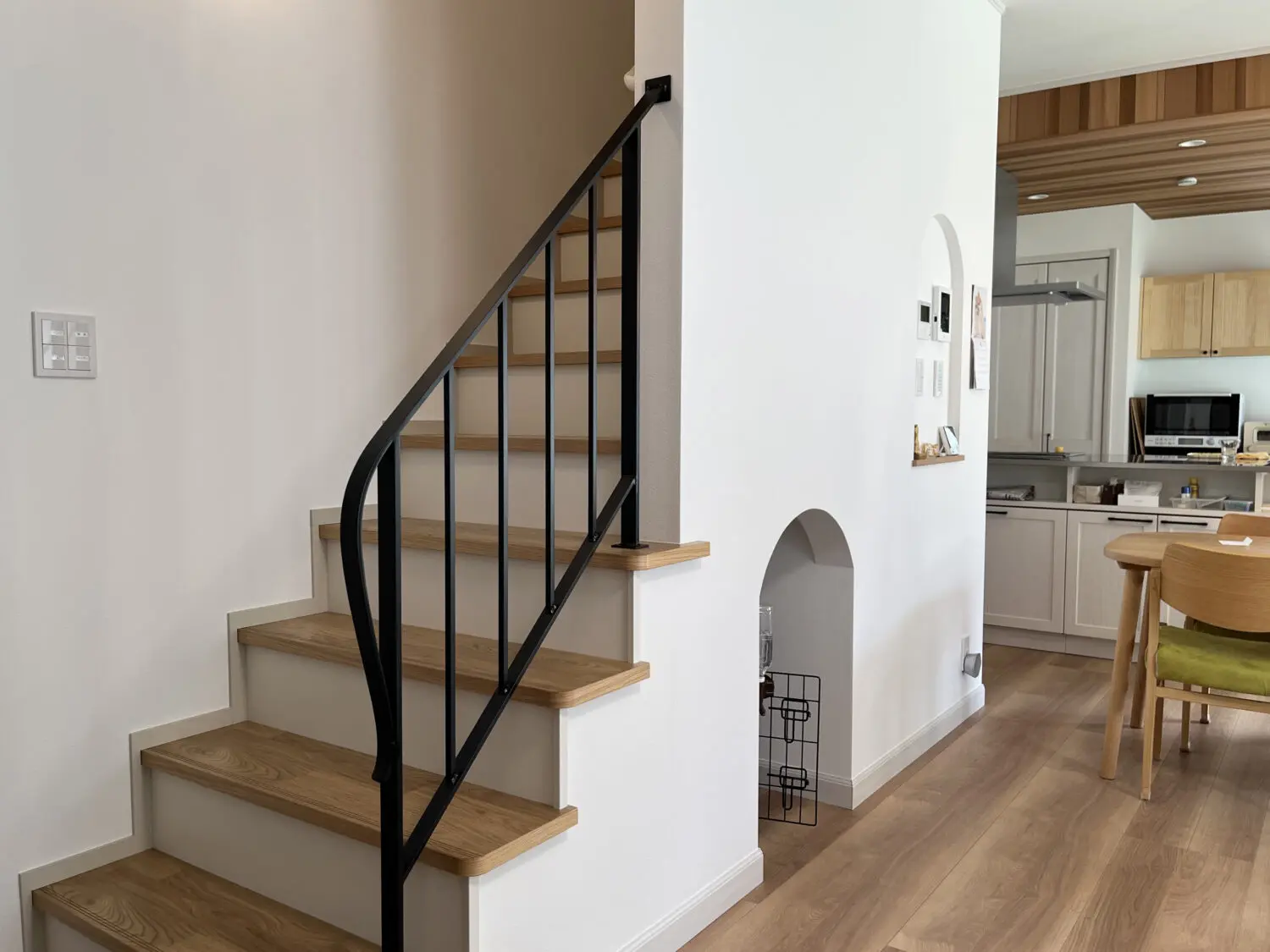 最後に、内装はアンティークな雰囲気とお客様の好みで仕上げられていて、今回のシンプルな手摺もスタート部分のくるっとした所を極力抑えられないか?とご相談頂き、くるっとした部分をなくしてナチュラルな雰囲気になっています!