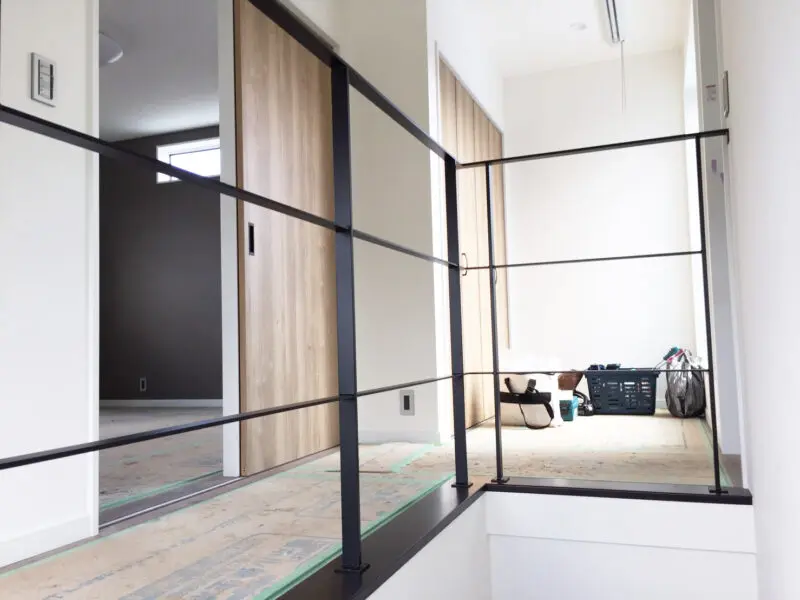 今回は滋賀県からのご依頼です。このような廻り階段の上の吹き抜け部分に、L型にした吹き抜け手すりのお問合せは凄く多いんです。腰壁を付けるのもいいのですが、鉄で作ると細い部材で手摺が出来るので、この様に空間を広く見せる事が出来ます!ですが、ここで1つ問題になってくる事が、遠方だと一体型では発送出来ないと言う事です。今回は滋賀県で少し遠く(120km以内)、搬入路が狭い為分割で製作しましたが、まさにこの分割式(オプション加工)にする事で、発送も可能になりました。
