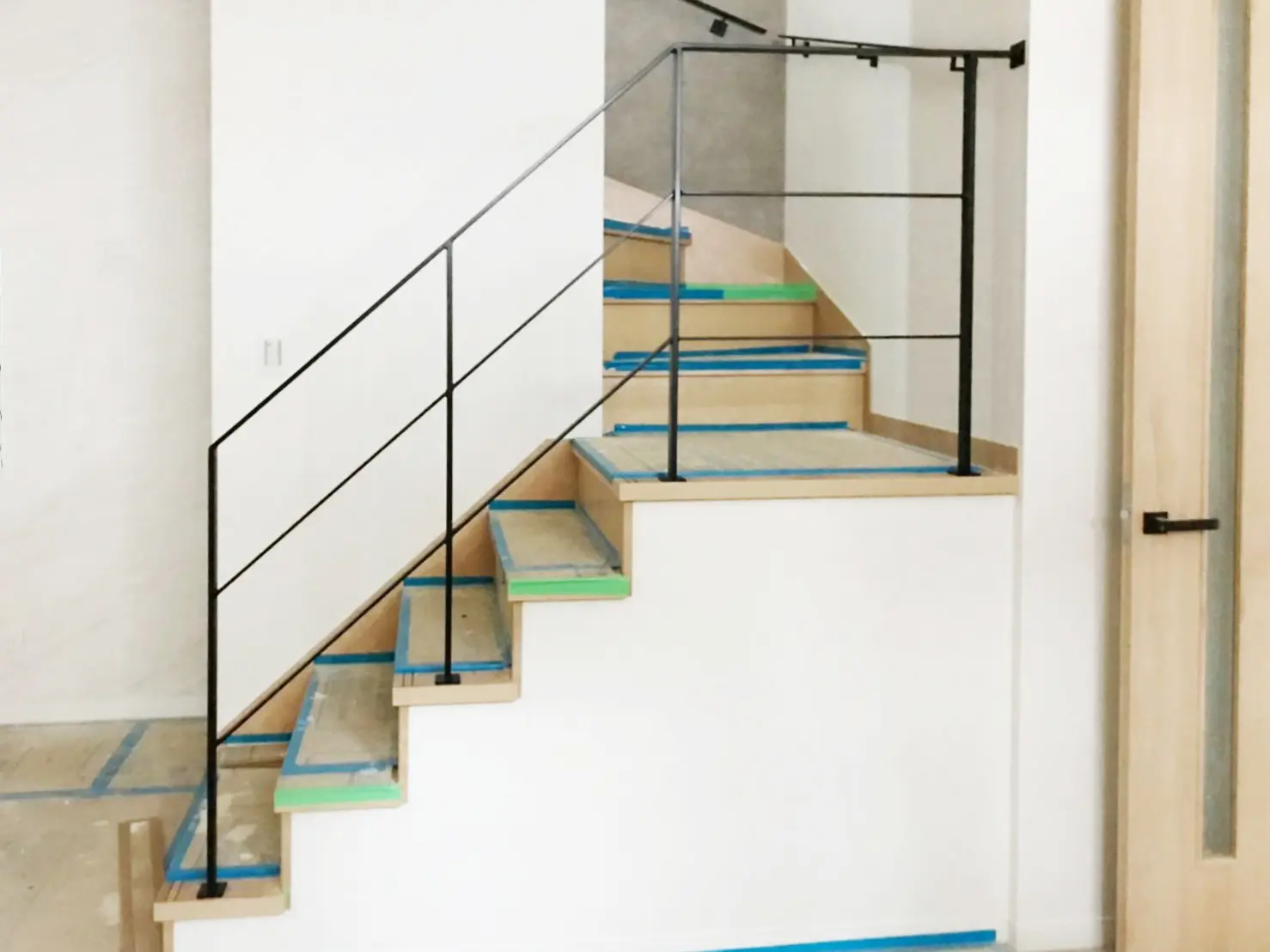 写真は養生中で少しわかりにくいですが、このセットは、シンプルで繋がりがあるので1〜2階の繋がりがとても良く見えます。きっとお家に来られたお客様が、まず目に入って素敵だと思ってくれると思います。