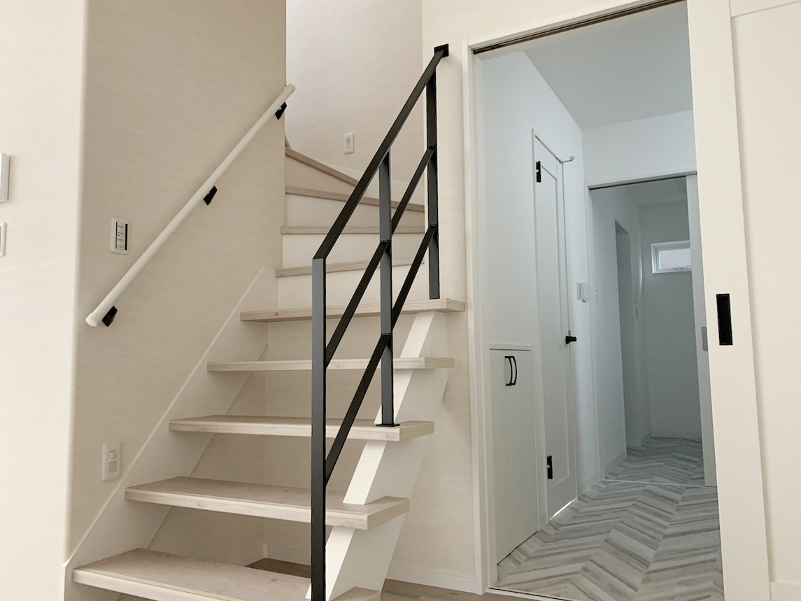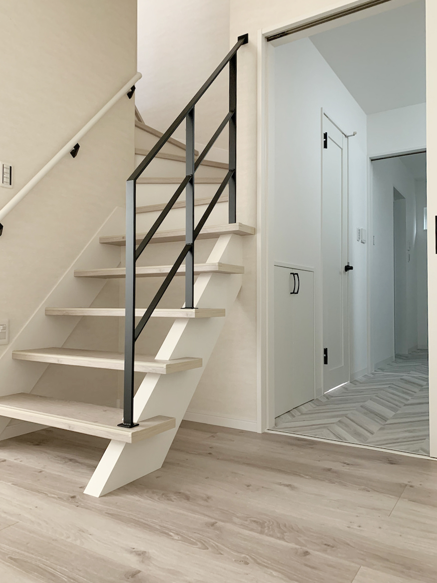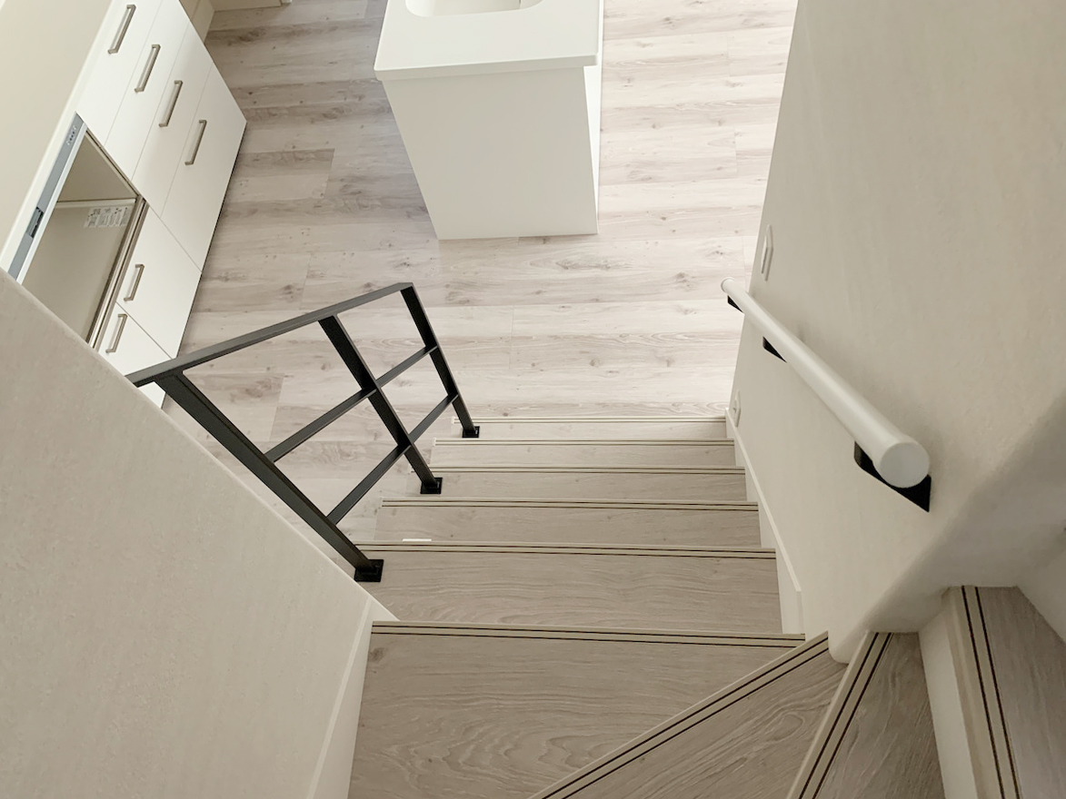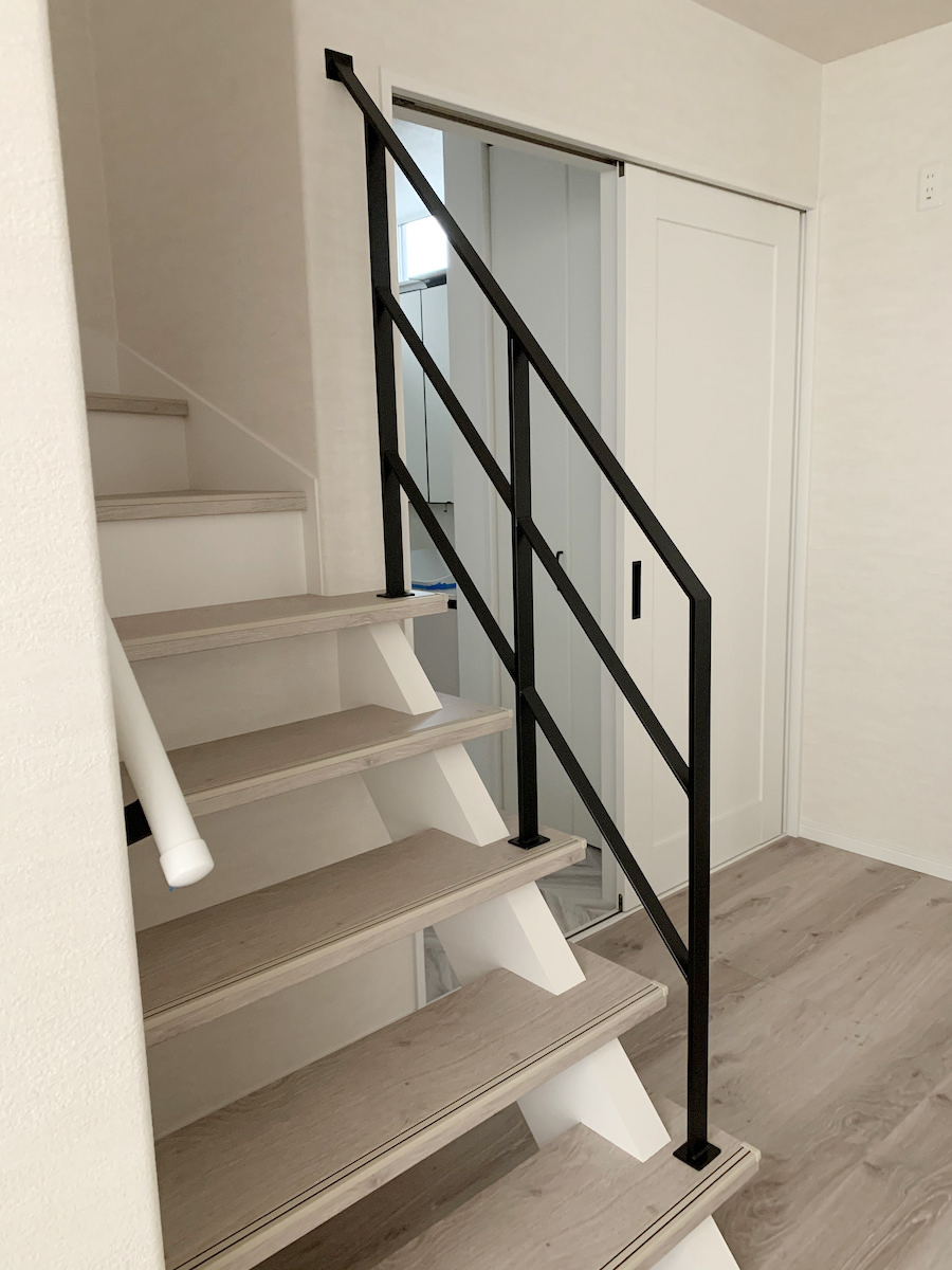 今回の階段は少し特徴的で、ササラ(階段側面の板)が踏み板の上に露出している形状でした。そのため、ササラに当たらないよう寸法や取付位置のバランスを丁寧に調整しながら製作しています。