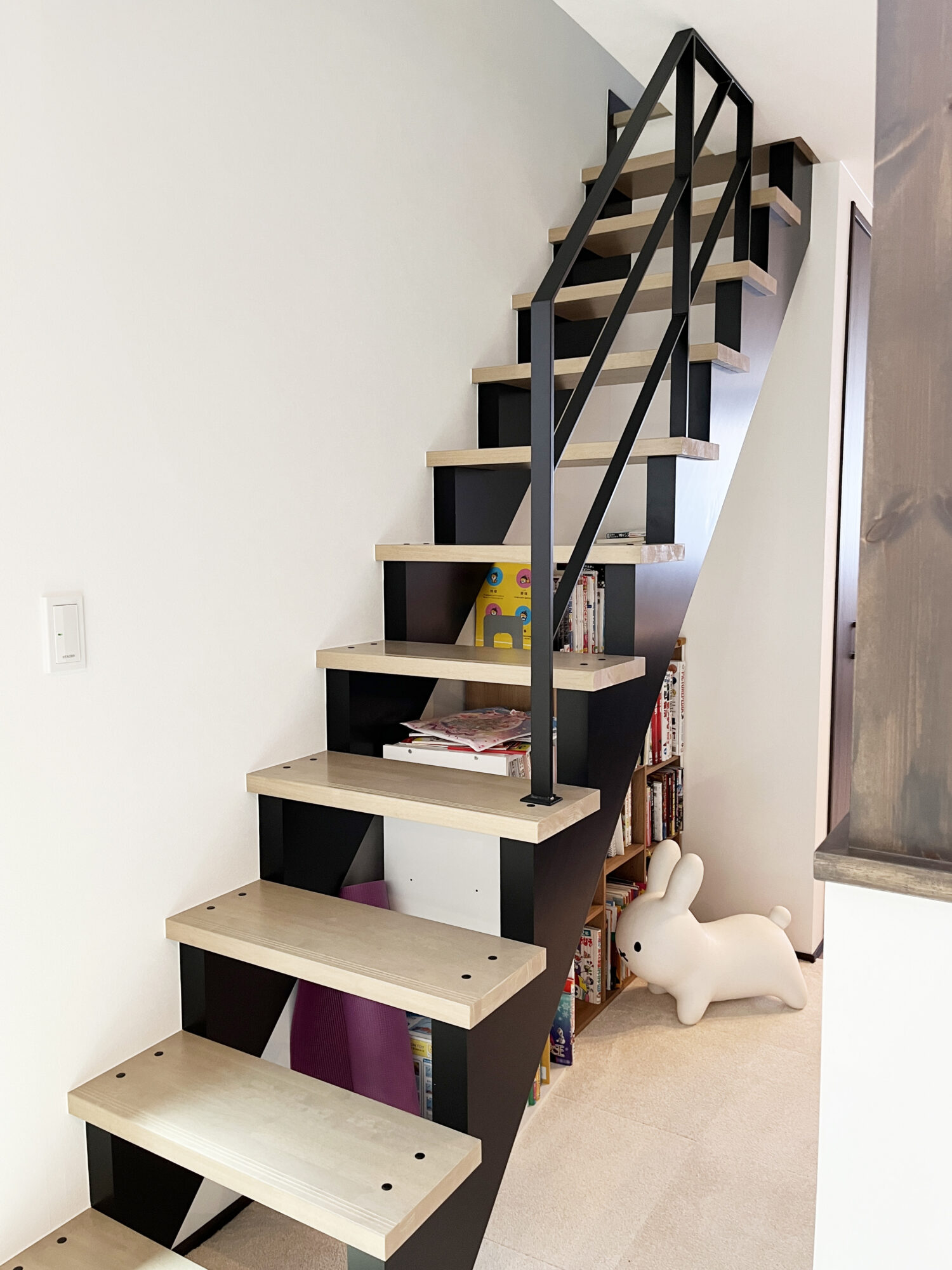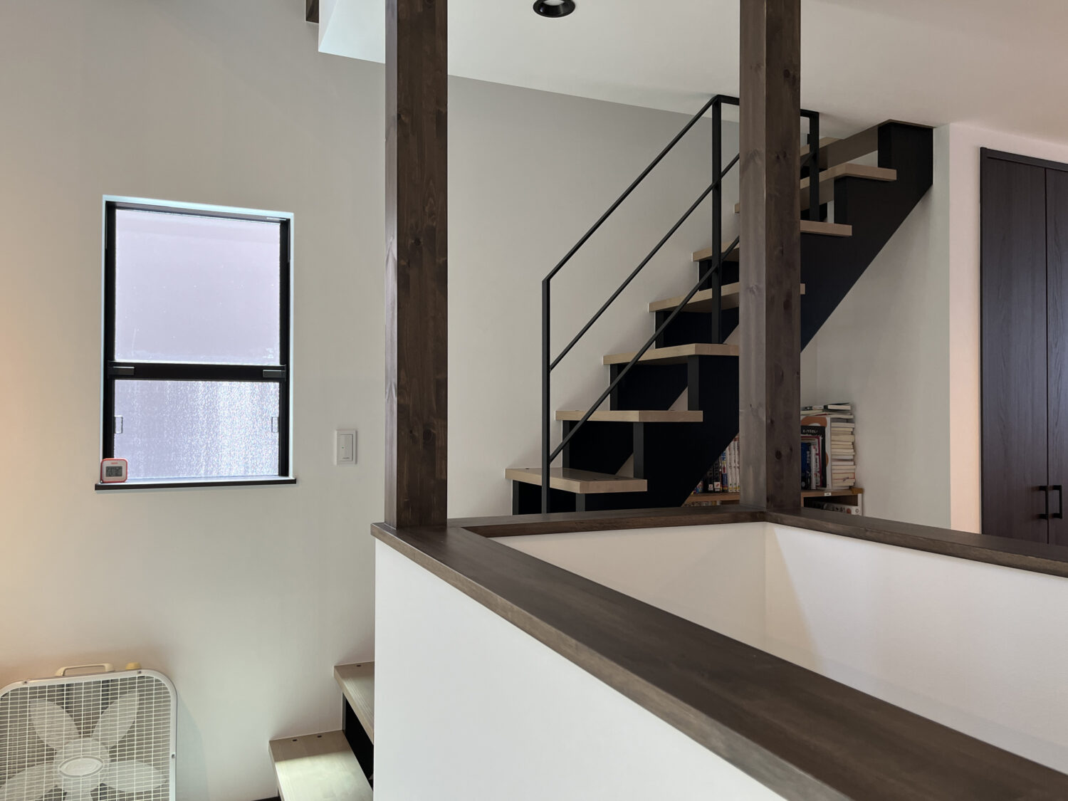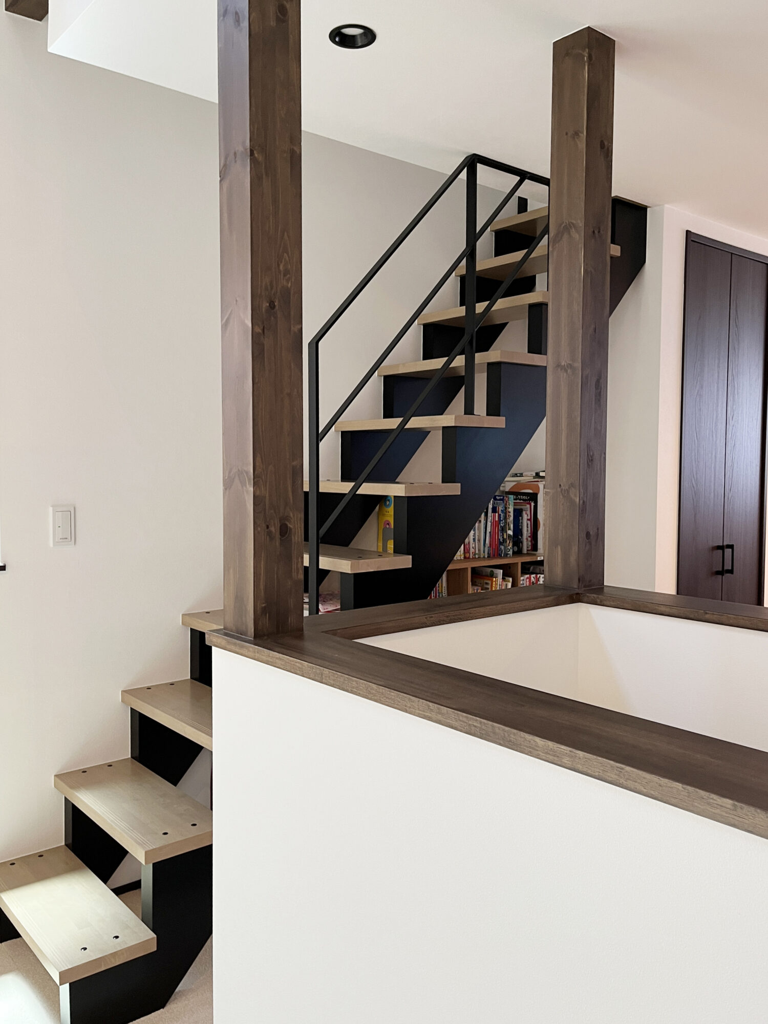 見ての通り1段目からではなく4段目から始まる階段用手すり。手前に階段の吹き抜けがあり、お子様が階段から吹き抜けの腰壁に渡ってしまわないか心配という理由と、1段目から手すりをつけてしまうと圧迫感が出てしまうため、4段から始まる手摺になったんです!