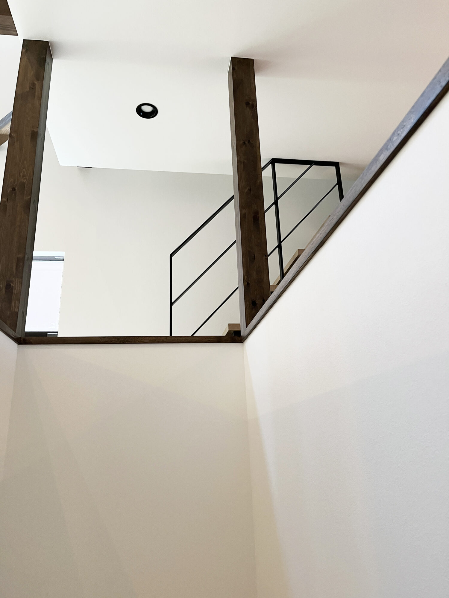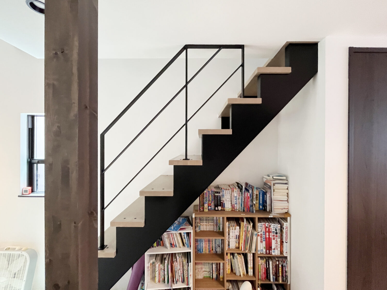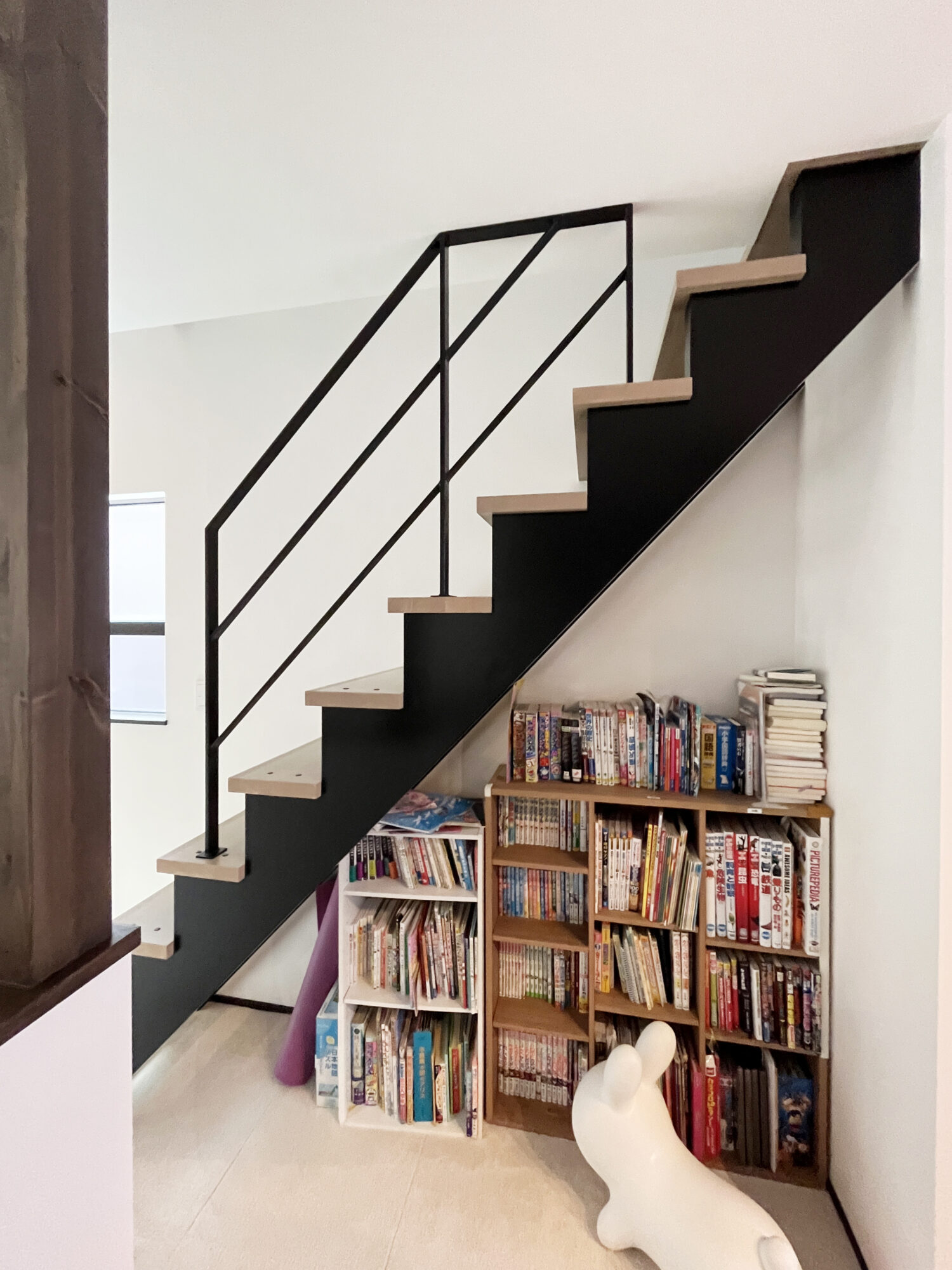 見ての通り1段目からではなく4段目から始まる階段用手すり。手前に階段の吹き抜けがあり、お子様が階段から吹き抜けの腰壁に渡ってしまわないか心配という理由と、1段目から手すりをつけてしまうと圧迫感が出てしまうため、4段から始まる手摺になったんです!
