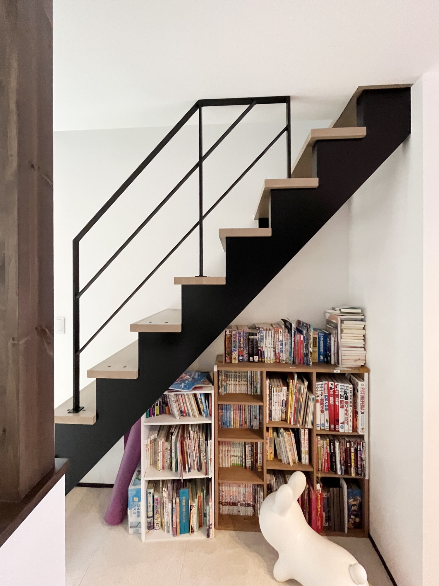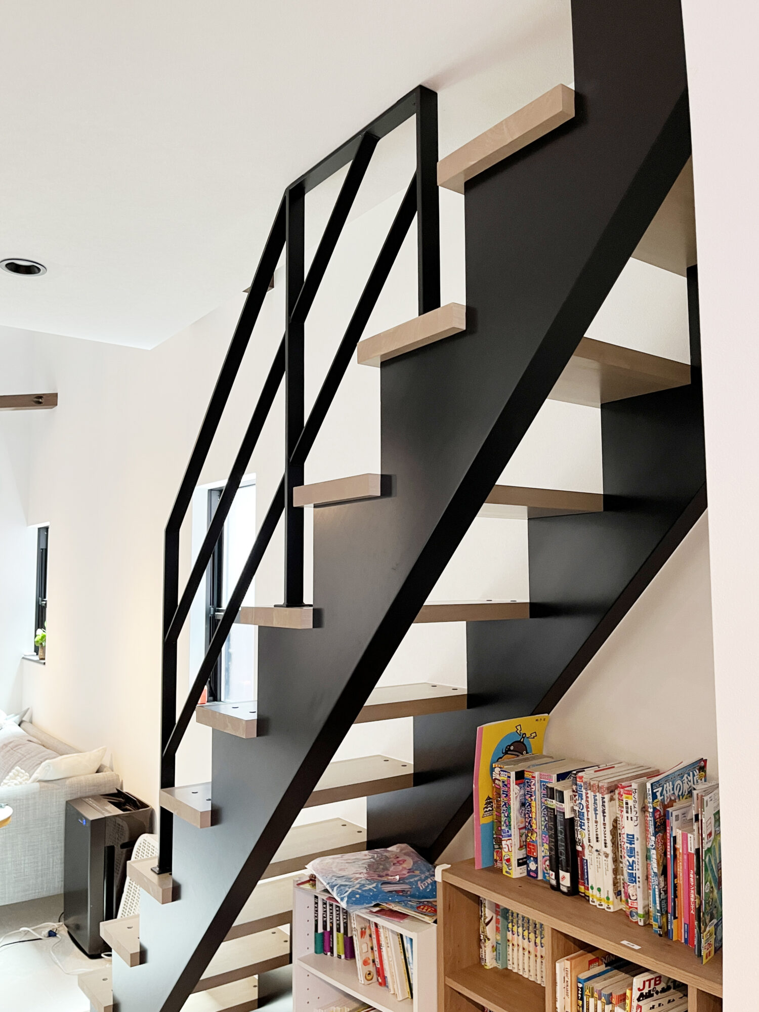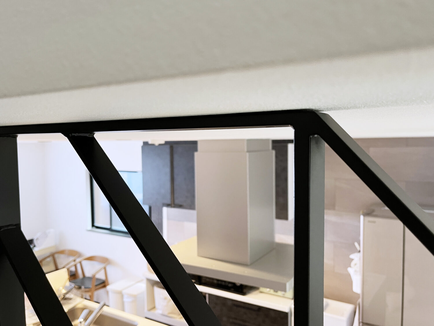 その他も少しづつ工夫しているところがあります!天井に干渉する6段分の手すりなので、天井とあたる7段目(真ん中のアイアン手すりの柱)の部分で天井と平行にするため、手すりの高さをH728㎜してバランスを整え、残りの階段3段に手すりではなく、最後の1段は空けて2段分にしました。少しでも圧迫感を減らし、デザイン的にもすっきりさせました。