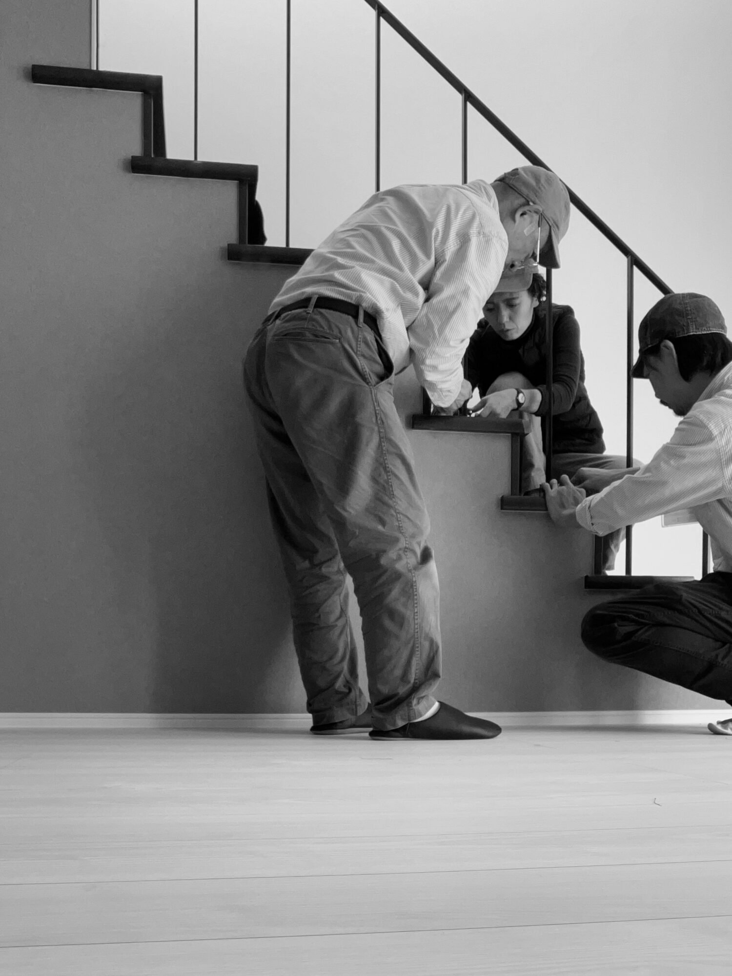 まず階段は8段分あります。写真のように一段一段柱をつけていくことはものすっごい難しいんです。「図面通りにきっちり作れば大丈夫じゃないの?」と思われる方もおられると思います。(まず図面はあくまで図面上の寸法なので、実際の寸法には誤差があります。)ですが、いくら階段をきっちりはかっても、階段の微妙なコケや工房で鉄を加工して制作する際に出る微妙な誤差などがあるからです。