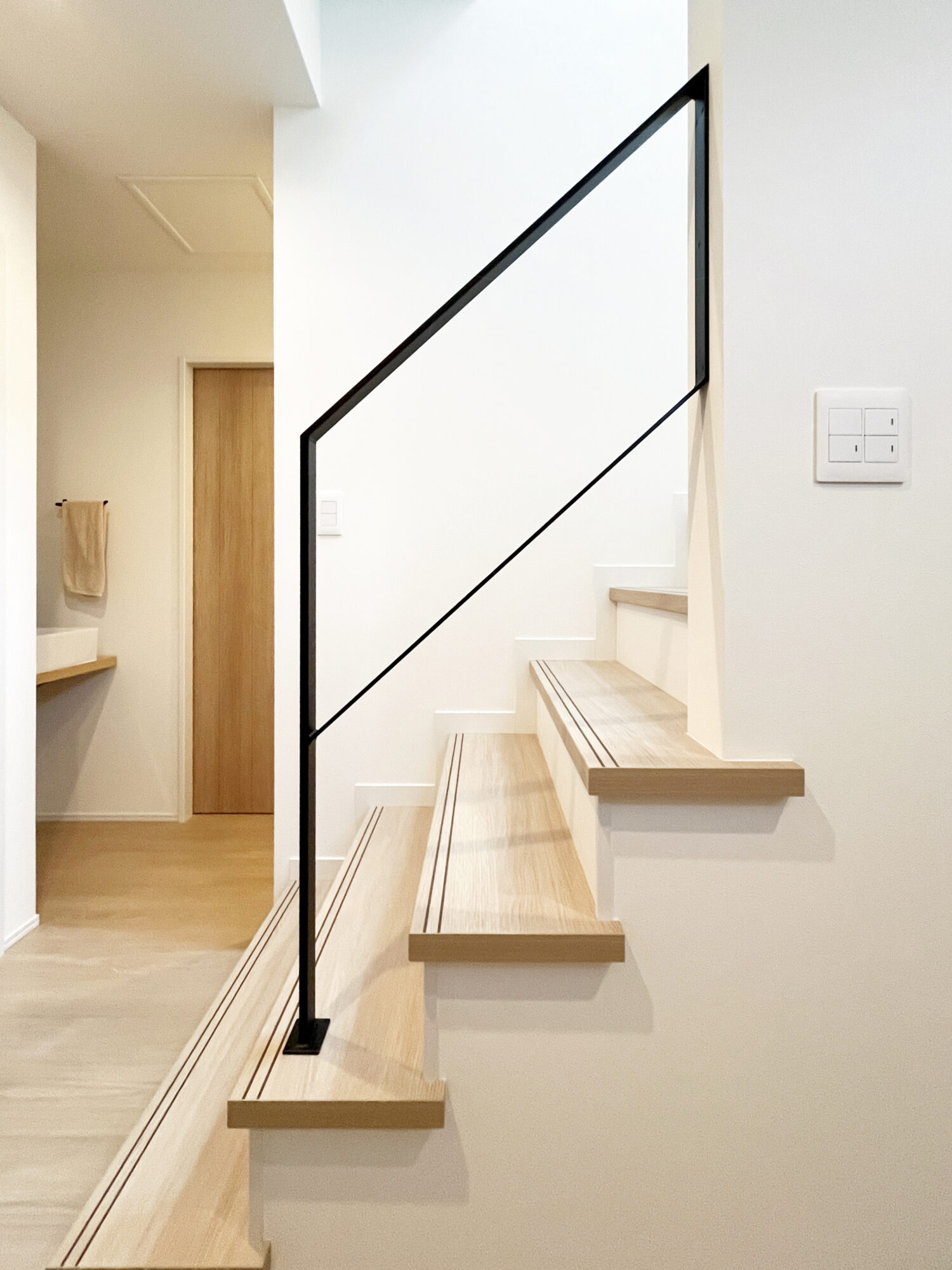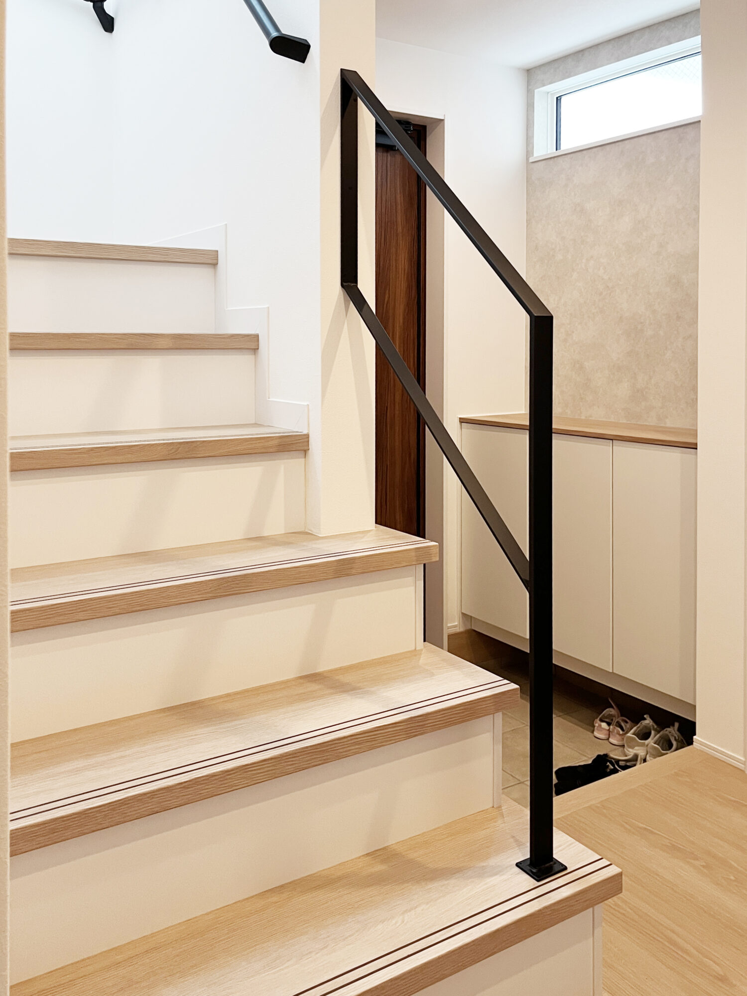 2月にお電話頂いた時、1段目から始まる4段の手すりとお聞きしていたので、お引き渡ししてからお引越しの後に施工が出来れば、大きい荷物も運びやすくて良いのでは?とお話しさせて頂きました。(工務店さんの社内規定上難しい場合もありますが、1段目から始まる4段は建築基準法には含まればいので、実際に生活してみてから考えられるメリットもあります!)