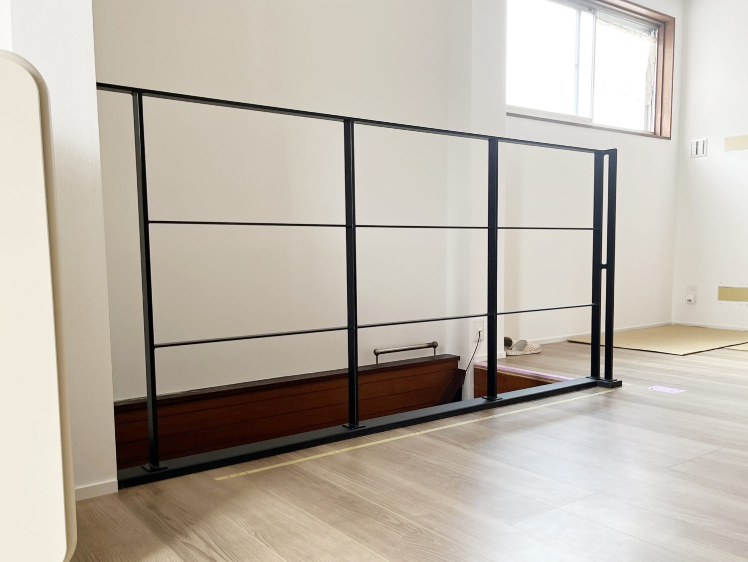 写真をみると、シンプルで何も問題ない手摺に見えますが、足元の下地に電気の配線があり、吹き抜け側に長いビスを入れられないということで、強度を上げるため【補強のバットレス】【高さを低めに】することをご提案しました。